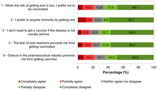 Attitude is a “latent variable”, i.e., a variable that cannot be observed or measured directly but that can be defined based on other variables that can be observed/measured. Therefore, participants were asked to indicate their degree of agreement or disagreement with the statements proposed in the questionnaire (Figure 3). It was considered that respondents who disagreed with a statement had an attitude in favor of vaccination.