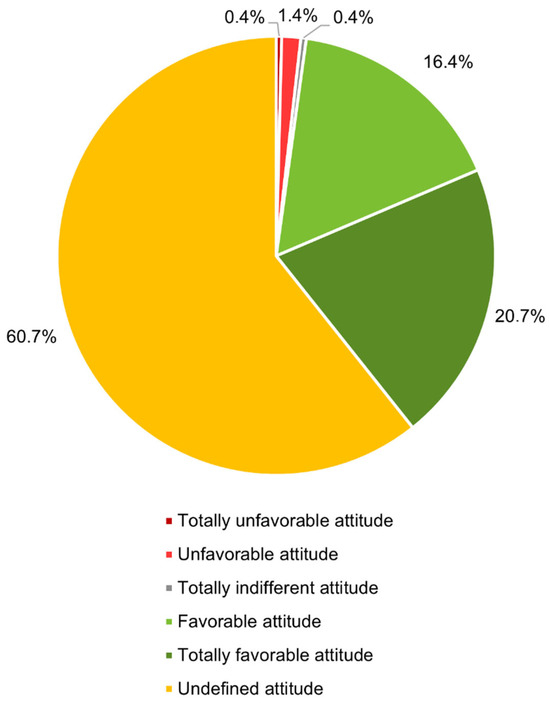 In this way, we were able to determine that the majority of participants in the study (60.7%, 314/517) did not have a defined attitude toward vaccination, while 20.7% (107/517) showed a completely favorable attitude toward vaccination (Figure 4). Overall, 37.1% (192/517) tended to be favorable to vaccination, and only 1.8% (9/517) tended to be unfavorable to it.