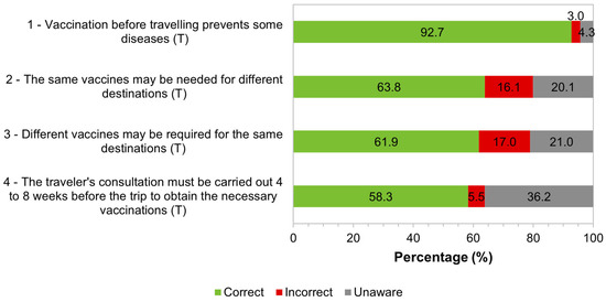 Participants demonstrated their knowledge by answering “True”, “False”, or “Unaware” to the sentences presented. For each sentence, a correct answer was considered when the participants in the study answered “True” to the statements in the questionnaire. The distribution of answers can be seen in Figure 5. The majority demonstrated that they were aware of the importance of vaccination in preventing diseases in international travelers (92.7%, 493/532); they were also aware of the fact that the same vaccines may be recommended for different destinations (63.8%, 337/528); they considered that different vaccines may be necessary for travelers traveling to the same destination (61.9%, 327/528); and that the traveler’s consultation should be carried out four to eight weeks before the trip (58.3%, 309/530).