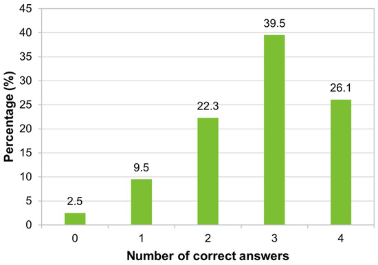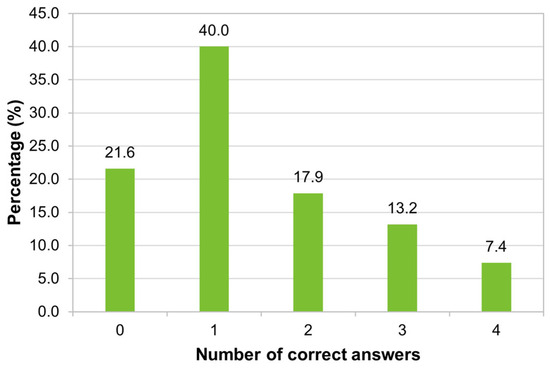 The largest percentage of participants in the study (40%, 206/515) answered only one of the four questions correctly, and 21.6% (111/515) did not answer any of the questions correctly. Only a small percentage (7.4%, 38/515) answered all of the questions correctly (Figure 8).
