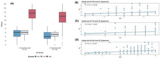 (A) Comparison of different scores (RKI, PKI, MKI) according to the number of melioidosis resources used (≥2 recourses or <2 resources). Dots represent outlier points. (B–D): Correlation between the number of resources used and the different knowledge scores. RKI: Risk Knowledge Index; PKI: Protective Knowledge Index; MKI: Melioidosis Knowledge Index; ISI: Information Source Index.