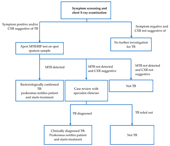 - Chan, G.; Triasih, R.; Nababan, B.; du Cros, P.; Wilks, N.; Main, S.; Huang, G.K.L.; Lin, D.; Graham, S.M.; Majumdar, S.S.; et al. Adapting active case-finding for TB during the COVID-19 pandemic in Yogyakarta, Indonesia. Public Health Action 2021, 11, 41–49. [Google Scholar] [CrossRef] [PubMed]