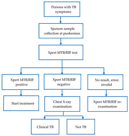 Kulon Progo District is a rural district in Yogyakarta Province, with an area of 586.28 km2. The total population is 443,283 people spread over 12 sub-districts, 87 villages, and 917 sub-villages [13] (Figure 1). Of the total population, 49% are men, and 51% are women. The proportion of the working-age population (15–64 years) is 67.8%. There are 21 primary healthcare centres (puskesmas), two government hospitals, and seven private hospitals that provide TB services. There are two puskesmas (Kalibawang and Galur 2) and two hospitals (RSUD Wates and RSUD Nyi Ageng Serang) that can carry out TB microbiological examinations using the GeneXpert platform with Xpert MTB/RIF cartridges [14].