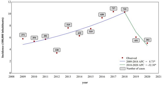 Jointpoint regression temporal analysis of the incidence and number of cases of VL from 2009 to 2020. * p-value ≤ 0.05.
