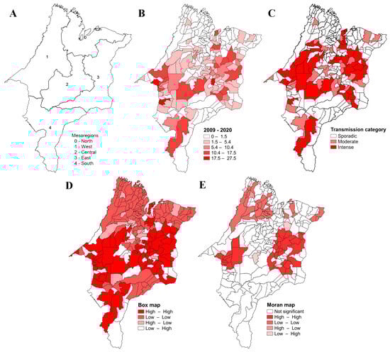 Geographical distribution and spatial analyses of the VL prevalence in Maranhão. Legend: (A) mesoregions of Maranhão; (B) mean accumulative prevalence of VL in Maranhão from 2009 to 2020; (C) category transmission of VL; (D) box map; (E) Moran map.
