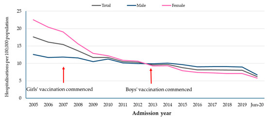 To our knowledge, no other Australian study has reported anogenital hospitalisation rates as late as until the year 2020, but a study that compared new genital warts diagnoses among patients who attended a sexual health clinic in Australia before vaccination (2004–2007) and after vaccination (2007–2018) showed that across both genders, aged <21 years, 21–30 years, and 31–37 years, there was a significant reduction, and there was also a reduction in males aged >37 years, but not in females aged >37 years [20].