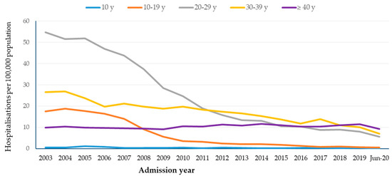 Hospitalisation rates were calculated per 100,000 population over relevant 12-month periods using the corresponding mid-year resident population estimate. Rates were stratified by sex and by age group (<10 years, 10–19 years, 20–29 years, 30–39 years, and ≥40 years). To make the data meaningful without having excessive decimal points, all rates were rounded after one decimal point, and two decimal points were used for rate ratios and the 95%CI.