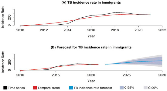 After modeling the temporal trend of the event, using the same package mentioned, predictions were made up to the year 2030 to verify the behavior of the temporal trend of TB in international migrants in the coming years through the “auto.arima” command, which is based on the Box–Jenkins methodology or Autoregressive Integrated Moving Average model [22,23].