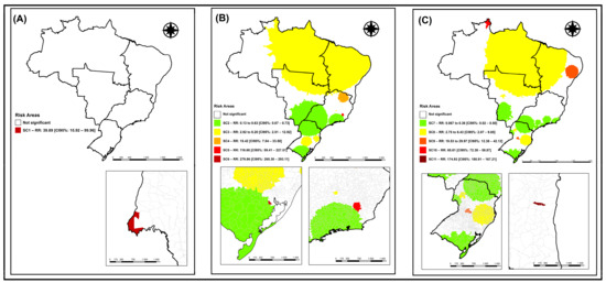 In the spatial analysis and identification of risk and/or protection areas of the analyzed event, initially, to verify if there was a change and how the formation of purely spatial TB clusters in international migrants occurred, we opted to divide the analyzed period into four-year periods, with Figure 2A representing the period from 2010 to 2013, Figure 2B that from 2014 to 2017, and Figure 2C that from 2018 to 2021.
