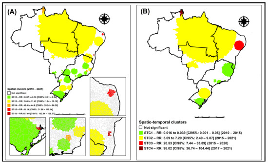 In addition, the relative risk (RR) and confidence interval (95% CI) of each cluster were calculated, allowing the comparison of information in different areas, except for SVTT, as explained. The RR of the identified cluster may not be within the CI. Clusters with p < 0.05 were considered statistically significant.