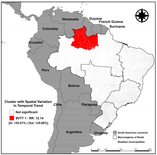 In addition to spatial and spatiotemporal analysis, the spatial variation in temporal trend (SVTT) technique was performed, which differs from the other techniques presented earlier by calculating the clusters’ temporal trends [26].
