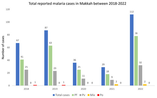 Study design: This is a cross-sectional retrospective study. Data on all confirmed cases of malaria reported to the Vector-Borne and Zoonotic Diseases Administration (VBZDA) in the Department of Public Health were collected in Makkah, Saudi Arabia, from the years 2018 to 2022. The data were collected after obtaining written approval from the Ministry of Health, Saudi Arabia. The data were collected in the form of a Microsoft Excel sheet. The personal identifiers in the data were removed, and a code was given to every case to protect the identity and personal information of the patients. The data were stored in a password-protected computer. The Ministry of Health in the Kingdom of Saudi Arabia has a policy of performing thick and thin blood films on patients who have a clinical suspicion of malaria. Additionally, Plasmodium species are identified using molecular methods. All confirmed cases of malaria in hospitals and primary healthcare facilities must be reported to the local malaria elimination program unit within 24 h of diagnosis [17]. The malaria elimination program unit’s office then sent all the collected data to the Department of Public Health, Ministry of Health, Saudi Arabia. Weekly analyses of data are given to the Ministry of Health’s Preventive Medicine branch. Surveillance data tabulation, figure generation, and simple analysis for this descriptive epidemiological study were performed using Microsoft Excel, version 2403 and SPSS software, version 15.0 (SPSS Inc., Chicago, IL, USA).