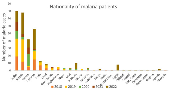 The nationality of patients diagnosed with malaria infection in Makkah in different years. Sudani, Nigerian, Yemeni, Pakistani, and Indian nationals accounted for majority of malaria cases in Makkah during the period 2018–2022.