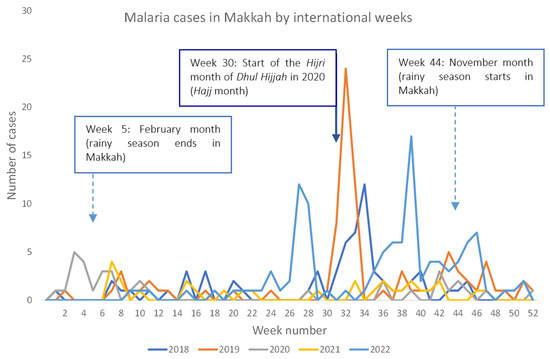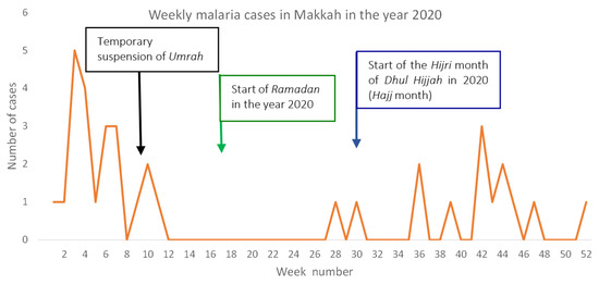 We analyzed the occurrence of malaria in Makkah by week to understand the timings of malaria cases in Makkah. Makkah receives its annual rains in the winter season in the months of November to January [5]. Interestingly, malaria does not peak in rainy seasons in Makkah, suggesting that malaria cases might be independent of rainy seasons in Makkah (Figure 3). Instead, malaria cases in Makkah peak at the time of Hajj and Ramadan, the time when Makkah receives the most visitors in the year to perform Hajj, Umrah, and prayers at Al Masjid Al Haram.