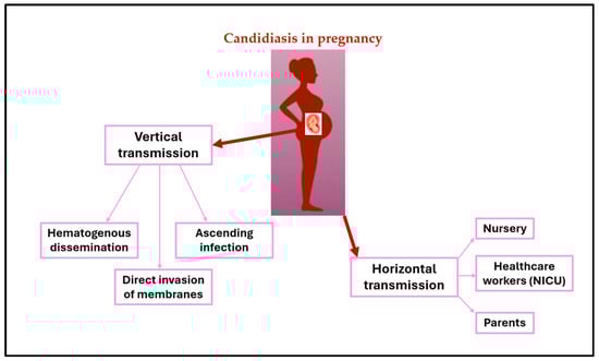 Vertical transmission of Candida spp. from a mother who has been colonized or affected by Candida spp. during pregnancy usually involves the transmission of Candida strains to the newborn during the perinatal period via the genitourinary or gastrointestinal tract [55]. Studies using molecular typing techniques have shown that vertical transmission of Candida albicans has been detected in 33% of preterm infants born to mothers with VVC [56]. When Candida chorioamnionitis occurs, it can lead to intrauterine fetal death or preterm delivery. Mechanisms for intrauterine infection include hematogenous dissemination from mother to fetus, direct invasion of membranes, and ascending infection after spontaneous rupture of membranes. Vertical transmission of Candida spp. may result in severe forms of early-onset systemic infection in the neonate, with cutaneous congenital candidiasis (CCC) being a common clinical feature [57,58,59].