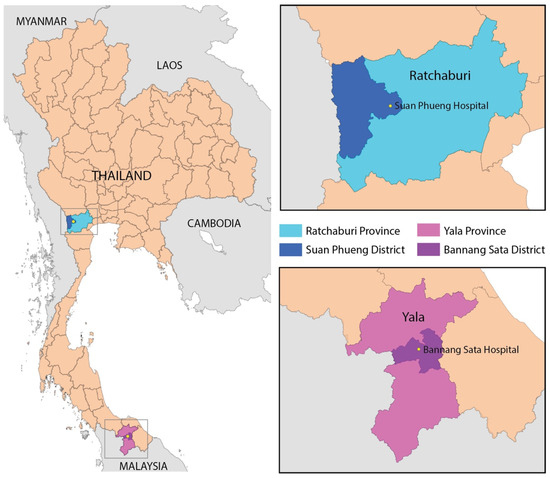 A map of Thailand illustrating the locations of the study sites. Blood samples were collected from P. vivax-infected patients residing in Bannang Sata District, Yala Province, and the Suan Phueng District, Ratchaburi Province.