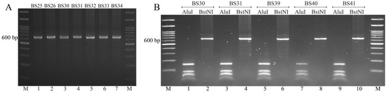 PCR product sizes and genotypes of Pvcsp. (A) PCR products of Pvcsp from representative southern isolates (BS25, BS26, BS30, BS31, BS32, BS33, and BS34) from Yala Province. (B) RFLP analysis of Pvcsp fragments. In odd-numbered lanes, the PCR products were digested with AluI (an enzyme that cuts repeatedly in the VK210 repeat region). In even-numbered lanes, the fragments were digested with BstNI (an enzyme that cuts repeatedly in the VK247 repeat region). Paired digestions of the fragments obtained from representative southern isolates (BS30, BS31, BS39, BS40, and BS41) from Yala Province are presented. A 100 bp DNA ladder was used as a molecular weight marker (M).