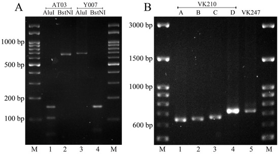 In the western samples, both VK210 (90%, 9/10) and VK247 (10%, 1/10) were detected (Figure 3A). On the basis of PCR band size variations, four distinguishable size variants with lengths of between 600 bp and 700 bp were observed among the western VK210 strains (Figure 3B). Allelic size variant C (>650–700 bp) dominated at a frequency of 56% (5/9).