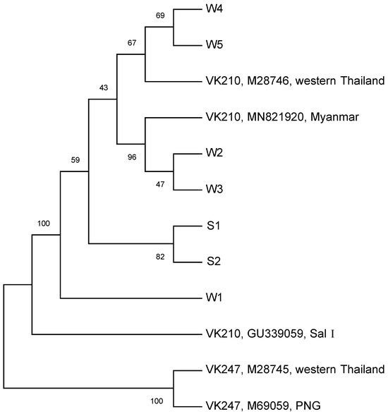 The Pvcsp sequences of the VK210 subtypes (S1 and S2 from Yala and W1–W5 from Ratchaburi) were compared with the reference sequences available in GenBank (M28746 for VK210 from Thailand, GU339059 for VK210 strain Salvador I, MN821920 for VK210 from Myanmar, M28745 for VK247 from Thailand, and M69059 for VK247 from Papua New Guinea). Both the VK210 and VK247 type sequences are clustered into two distinct divisions (Figure 4). For the VK210 type, each division consisted of several sub-divisions. The phylogenetic tree illustrates the separation between the southern P. vivax variants and those from the western region. W4 and W5 were closer in proximity to the reference VK210 from western Thailand collected in 1989 [17] than the other subtypes. W2 and W3 were closely related to P. vivax, which was collected from Naung Cho, Myanmar, in 2013 [28]. W1 had an additional repeat motif, GGRADGQPA, distinct from the common GDRA [D/A] GQPA in the CRR, setting it apart from the other variants analyzed in this study.