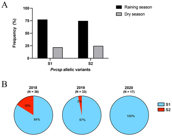 (A) Distribution of VK210 variants during different seasons: June to October (rainy season) and November to May (dry season). (B) Frequency distribution of Pvcsp allelic variants, S1 and S2, in southern P. vivax isolates. Analysis of 88 isolates from the period from 2018 to 2020.