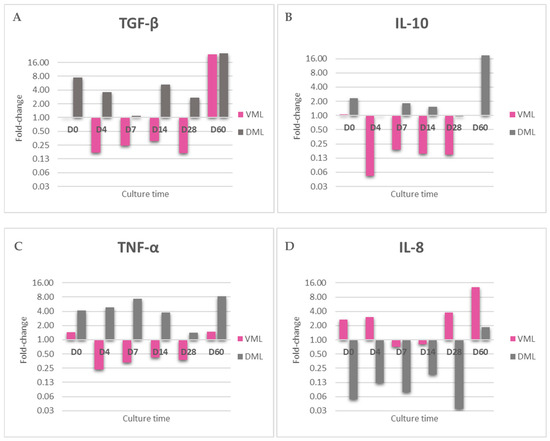 Interaction between M. leprae and skin. Relative gene expression of cytokines (A) TGF-β, (B) IL-10, (C) TNF-α and (D) IL-8 in fragment with viable M. leprae (VML) and dead M. leprae (DML) comparing with saline group during the follow-up period, calculated by the 2ΔΔCT method based on CT value obtained from RT-PCR using 18S rRNA as reference gene and the Saline group as Normalizer. The analysis was performed on 3 female skin.