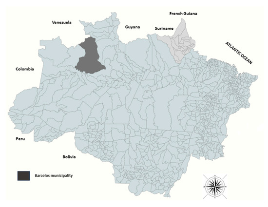 Geographic location of the municipality of Barcelos within the region of the middle Rio Negro, Brazilian Amazon.