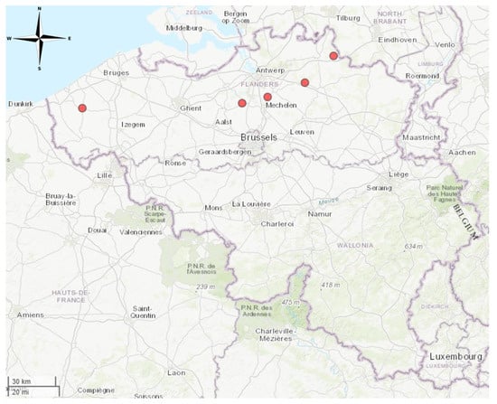 Collection sites in Flanders where bats were captured for saliva and blood collection and sampling. Sampling sites indicated on the map from left to right are Diksmuide, Liezele, Duffel, Herentals and Arendonk. Map created in R using the mapview package (https://cran.r-project.org/web/packages/mapview/index.html, accessed on 7 June 2024).