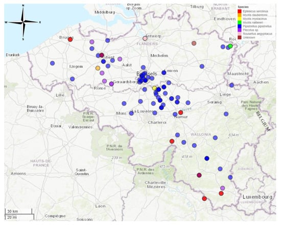 Eptesicus serotinus was found at 7 locations. Myotis daubentonii was found at one location (Gavere). Myotis mystacinus was found at one location (Lasne). Myotis nattereri was found at one location (Kinrooi). Pipistrellus pipistrellus was found at 58 different locations. Plecotus sp. were found at 6 different locations. Rousettus aegyptiacus was found at one location (illegally imported through Antwerp airport) (Table 2).