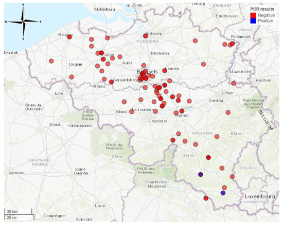 Locations in Belgium where bats were found during passive surveillance. Map created in R using the mapview package (https://cran.r-project.org/web/packages/mapview/index.html, accessed on 7 June 2024).