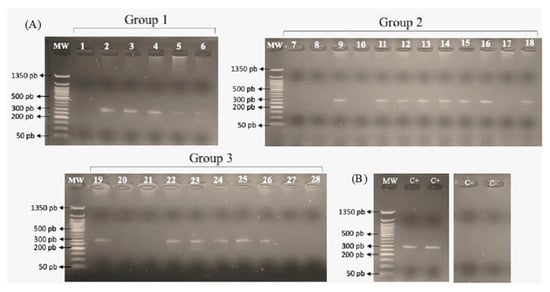 (A) Agarose gel showing PCR results to assess amplification of the V4 region of 16S rDNA. The lanes of the PCR gel are marked with the number (1–28) of the case to which the amplification corresponds in each group. (B) Agarose gel with results for positive control (bacterial genomic DNA) and negative control (mixture of PCR reagents without the presence of DNA) in duplicate.