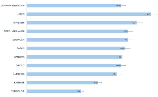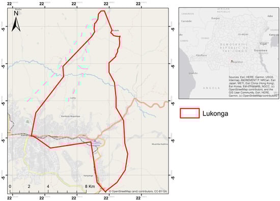 This study was conducted in the urban–rural health zone of Lukonga (See Figure 1), located in the city of Kananga and part of the 26 health zones within the Kasaï Central Provincial Health Division (DPS). The health zone covers an area of 172 km2 and has a population of 348,926 inhabitants. The Lukonga health zone is bordered to the north by the Demba health zone, to the south by the Ndesha health zone, and to the east by the Kananga health zone. The population of the Lukonga health zone has the lowest socio-economic status in the city, with an average daily income of less than USD 1. This is reflected in the low purchasing power. Lukonga has 19 health areas.