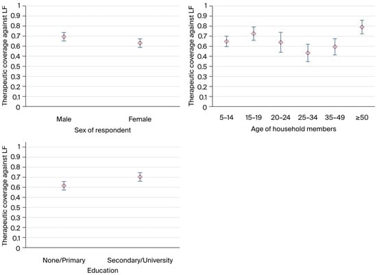 In terms of educational attainment, Figure 2 illustrates that the observed therapeutic coverage for those with a secondary/higher education level (70%) was higher than that observed for those with no/primary education level. The measured therapeutic coverage for the age group of 50 years and older was 78%, which was higher than the coverage for the other age groups (5 to 14 years, 15 to 19 years, 20 to 24 years, 25 to 34 years, and 35 to 49 years). It should be noted that the age group of 25 to 34 years had the lowest coverage, at less than 55%. Males had a higher measured therapeutic coverage (70%) than females (63%) (Figure 2). Religion did not affect the uptake of the medication.