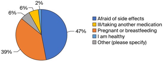 The results of this study indicate that the primary reason for non-compliance among those who received the medications during the 2022 MDA was a fear of side effects related to ivermectin (47%), followed by being pregnant or breastfeeding (39%). Additional details are provided in Figure 4.