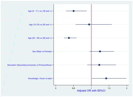 In the multivariate analyses, the following characteristics were identified as factors associated with uptake of MDA: Age of household member and household member knowledge. With regard to knowledge, respondents who had good knowledge level were more likely to swallow drugs (OR 1.42, 95% CI 1.02–1.98). Older age group (age of 50 years or above) was associated with swallowing the drugs (Figure 5).
