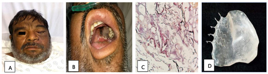 - Ravi, M.B.; Srinivas, S.; Silina, E.; Sengupta, S.; Tekwani, T.; Achar, R.R. Prosthetic Rehabilitation of Rhino Orbital Mucormycosis Associated with COVID-19: A Case Series. Clin. Cosmet. Investig. Dent. 2022, 14, 1–10. [Google Scholar] [CrossRef] [PubMed]