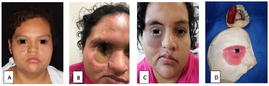Patient 3, a 22-year-old woman in the early stages of DM, presented with orbital cellulitis (Figure 2A); anisocoria, a necrotic lesion in the malar; and a 1 × 2 cm fistula on the right hard palate. A CT scan of the facial mass was performed, in which occupation on the right maxillary sinus was observed, with bone resorption on the anterior wall. Management included glycemic control, 42 days of liposomal amphotericin B treatment, and surgical intervention through a right hemimaxillectomy and orbital exenteration. During rehabilitation, the initial skin flap made had to be removed due to bacterial superinfection. A surgical ethyl vinyl acetate palatal obturator was placed, with orbital exenteration using the Ferguson-Weber approach, along with the placement of a right orbital radial skin graft (Figure 2B). An obturator adjustment was performed, and an intraoral impression was taken to change the obturator, creating a transitional polymethyl methacrylate obturator with metal retentions. Once healed, a definitive metal-acrylic obturator was made, as well as a custom silicone right orbitofacial prosthesis (Figure 2C,D). Due to the cost of treatment, it was not possible to transition the patient to oral maintenance therapy with posaconazole or isavuconazole. After the first surgery, there was no relapse of infection.