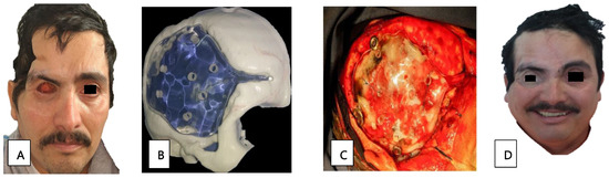 (A) Sequel state after exenteration of the orbit and skull base drainage. (B) Three-dimensional print for intracranial rehabilitation. (C) Cranioplasty for protein placement. (D) Intracranial rehabilitation and placement of a silicone orbitofacial prosthesis.