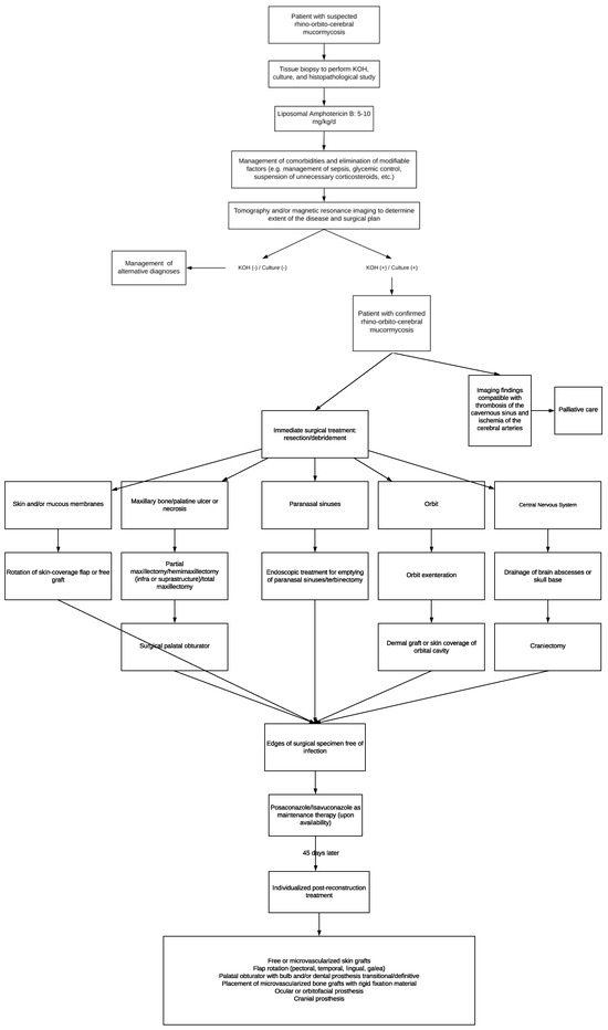 Due to the above and considering that the management of patients with mucormycosis must be conducted according to the availability of surgical techniques and regional antifungal treatments, we propose the following: an algorithm where the initial approach, medical, and surgical treatment, as well as rehabilitation, are integrated to increase the survival rate and improve the quality of life in these patients (Figure 4).