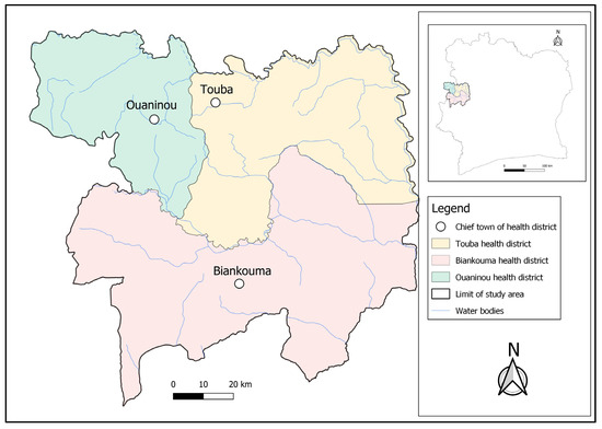 The study was conducted in three health districts located in the western part of Côte d’Ivoire; namely, Touba (geographical coordinates: 8°40′0″ N latitude; 7°30′0″ W longitude) and Ouaninou (8°14′00″ N; 7°52′0″ W) in the Bafing region and Biankouma (7°45′0″ N; 7°40′0″ W) in the Tonkpi region (Figure 1). According to the 2021 national census, there were 262,850 and 1,387,909 inhabitants in the Bafing and Tonkpi regions, respectively. The climate is humid tropical, with two seasons: the rainy season that lasts from March to October, and the dry season from November to February. Annual precipitation ranges from 1200 to 2000 mm.