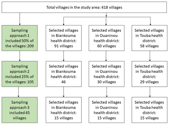 This study was a community-based, cross-sectional survey. It was conducted in August and September 2022 using three sampling approaches. The first approach included a random selection of 50% of the villages in each district. The second approach included a random selection of half of the approach 1 villages, hence, constituting 25% of the villages in each district. The third approach was the standard national procedure, including 15 villages that were randomly selected from approach 2 villages in each health district (Figure 2). Of note, the third approach was applied during the first national schistosomiasis mapping in 2013 and 2014 in Côte d’Ivoire [16] and served as the reference standard in the country.