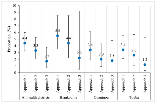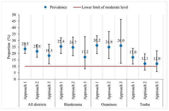 Based on the 95% CIs, we found similar prevalence estimates for the three sampling approaches. Similarly, at the unit of the health district, we observed that the estimated prevalence did not differ depending on the sampling approach. However, in the three health districts, the CIs are wider with the third approach compared to the other two. The prevalence obtained with the third approach is therefore less precise. The gaps are wider when comparing the third with the other two approaches in the districts of Ouaninou and Biankouma, while in Touba, they are quite small (Figure 3).