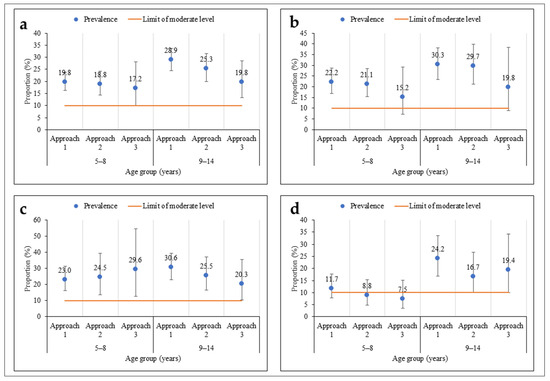 As regards age, there was no significant difference in prevalence according to the sampling approach (Figure 4). The prevalences were moderate among children aged 5–8 years and their older counterparts (9–14 years), regardless of the sampling approach. However, among children aged 5–8 years, the prevalences were less precise using the third approach compared to the other two, more extensive sampling approaches. The same pattern was observed within the health districts, except in Touba, where the prevalence was low in the second and third approaches among children aged 5–8 years.