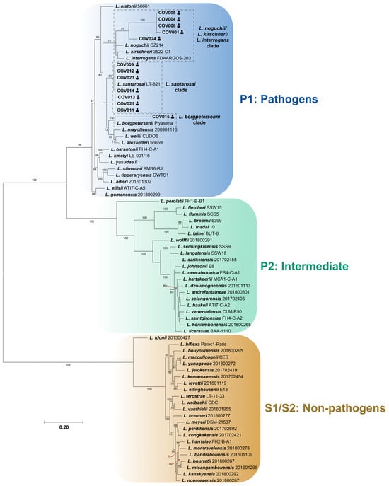 Leptospira spp. (order: Spirochaetales, family: Leptospiraceae) is a bacterial genus that comprises long, thin, and flexible Gram-negative spirochetes, some of which are pathogenic to a great number of animal species, including humans [1,2]. More than 66 Leptospira species have been officially recognized, of which at least 25 are well-known pathogens related to human and animal diseases [3]. Pathogenic Leptospira species are maintained in nature among a wide range of animal species such as rodents, canines, ruminants, and chiropterans. These animals develop persistent kidney colonization and shed the bacteria through the urine, acting as reservoirs [4,5,6]. Traditionally classified into pathogenic and saprophytic species [7], advances in molecular and phylogenetic analysis have rearranged Leptospira spp. into pathogenic, intermediate, and saprophytic groups [8]. Recently, the genus has been arranged into P1, P2, S1, and S2 clades to avoid a virulence assumption of novel Leptospira species [3]. Both classifications are currently being used with Leptospira spp. known to be pathogenic clustered within the P1/pathogenic clade [3,8].