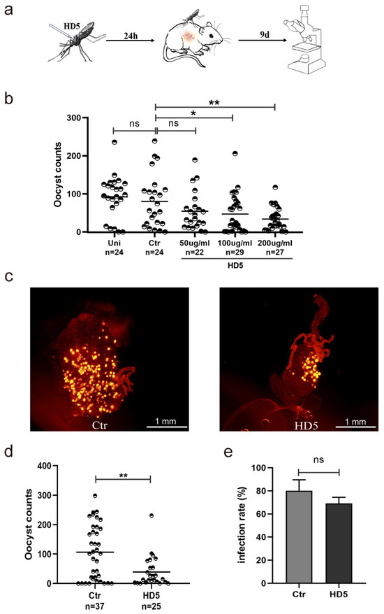 HD5 injection prior to infection decreased the density of oocysts in An. stephensi. (a) A schematic overview of HD5 treatment in An. stephensi. (b) The effects of different concentrations of HD5 on Plasmodium development in mosquitoes (c) The infection of P. yoelii in the midguts of An. stephensi (yellow dots represent oocysts). (d) The infection density of Plasmodium in mosquitoes between the HD5 (200 μg/mL) and control groups. (e) The infection rates of the HD5 (200 μg/mL) and control groups. Each dot represents the oocyst of an individual mosquito (a,d). Horizontal black bars indicate the median values. Significance was determined using Mann–Whitney tests in (a,d), and using the Chi-square test in (e). *, p < 0.05; **, p < 0.01; ns, no significant difference. Uni, un-injection; Ctr, control, injection with ddH2O; HD5, injection with HD5.