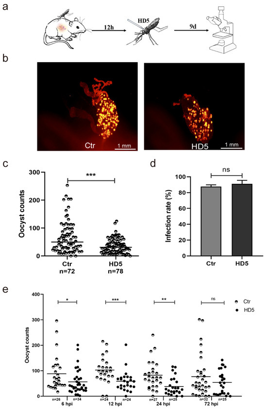 Post-infection HD5 injection inhibits P. yoelii infection in An. stephensi. (a) A schematic overview of HD5 microinjection into An. stephensi. (b) The infection of P. yoelii in the midguts of An. stephensi injected with ddH2O or HD5 at 12 hpi (yellow dots represent oocysts). (c) The infection density of Plasmodium in mosquitoes injected with ddH2O or HD5 at 12 hpi. (d) Plasmodium infection rates in An. stephensi injected with ddH2O or HD5 at 12 hpi. (e) The oocyst counts of Plasmodium in An. stephensi injected with ddH2O or HD5 at different time points. Each dot represents the oocyst of an individual mosquito. Horizontal black bars indicate the median values (c,e). Significance was determined using Mann–Whitney tests in (c,e) and using the Chi-square test in (d). *, p < 0.05; **, p < 0.01; ***, p < 0.001; ns, no significant difference. Ctr, control, injection with ddH2O; HD5, injection with HD5.
