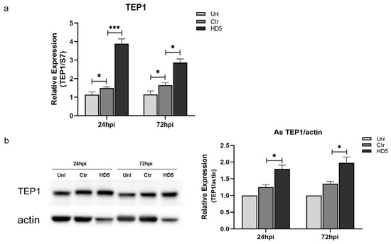 Studies have indicated that TEP1 plays a crucial role in mosquito resistance against malaria parasites [24]. The midgut epithelium is invaded and crossed by Plasmodium ookinetes, triggering a robust TEP1-involved, complement-like immune response [25,26]. As the main protein responsible for mediating Plasmodium lysis, TEP1 binds to the surface of ookinetes and mediates Plasmodium lysis [27]. To investigate whether HD5 treatment affected the expression of TEP1, real-time quantitative PCR and Western blotting were performed to detect changes in the transcription and protein levels of TEP1 by HD5 injection at 12 hpi. The results showed that HD5 treatment upregulated both the transcriptional and protein levels of TEP1 in mosquitoes at 24 and 72 hpi, compared to those in the control groups (Figure 3a,b). Additionally, the damage of injection upregulated the transcription levels of TEP1 but had minimal effect on protein levels comparing the un-injected and injected with ddH2O groups. These results suggest that HD5 treatment could increase the expression of TEP1 and improve the immune response of mosquitoes against malaria parasites.
