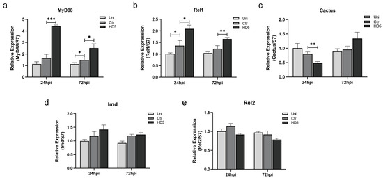 Parasites are killed by the innate immune system in mosquitoes [28]. Four major signaling pathways have been demonstrated to defend against pathogens, among which the Toll and Imd signaling pathways are considered to be mainly involved in anti-Plasmodium defense in mosquitoes [5,29]. To explore whether HD5 treatment activates the Toll or Imd signaling pathways and further influence oocyst development, the key effector molecules in the signaling pathways were evaluated using qRT-PCR. We detected the expression of MyD88, Rel1, and Cactus of the Toll signaling pathway. The expression of both MyD88 and Rel1 was upregulated at 24 hpi and 72 hpi, following HD5 treatment at 12 hpi (Figure 4a,b). The expression of the negative regulatory factor, Cactus, was downregulated at 24 hpi (Figure 4c). This indicates that the Toll signaling pathway was activated. In addition, we detected the expression of Imd and Rel2, which are two key molecules in the Imd signaling pathway. However, there was no significant change in the expression of these genes between the HD5 and control groups (Figure 4d,e), indicating that the Imd signaling pathway was not activated by HD5. These results suggest that the Toll signaling pathway may be activated by HD5 treatment, resulting in the upregulation of TEP1 expression which then results in a decline in oocyst count.