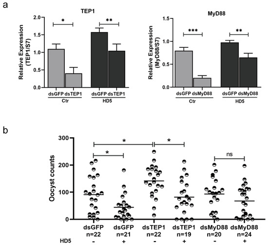 To confirm the role of Toll signaling pathway upregulation by HD5 treatment in the inhibition of malaria parasite development in mosquitoes, the gene expression of MyD88 and TEP1 was silenced using RNA interference (RNAi), followed by the observation of oocyst development. The gene expression of TEP1 and MyD88 was efficiently silenced, according to the qRT-PCR results (Figure 5a). As shown in Figure 5b, the inhibitory effect of HD5 on oocyst development decreased slightly when MyD88 expression was silenced by RNAi, indicating that the Toll signaling pathway plays a role in the HD5-mediated transmission blocking of malaria. There were more oocysts in the dsTEP1 group than in the dsGFP group without HD5 treatment, which indicated the role of TEP1 in the killing of Plasmodium. In addition, there were fewer oocysts in the HD5 group than in the control group after the injection of dsGFP, which further confirmed the inhibitory effect of HD5 treatment on oocyst development. Nonetheless, HD5 reduced oocyst counts when TEP1 expression was silenced by RNAi, indicating that HD5 treatment may also affect other immune effectors, in addition to TEP1, in the Toll signaling pathway to inhibit oocyst development. In summary, these results suggest that the activation of the Toll signaling pathway by HD5 reduces the susceptibility of Anopheles mosquitoes to Plasmodium.