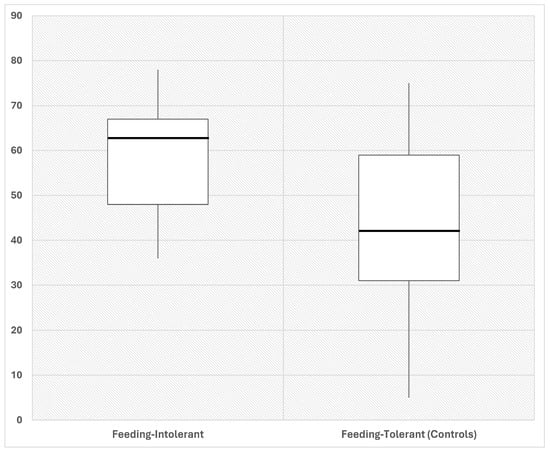 The main clinical characteristics of participating cases and controls are summarized in Table 1. Baseline clinical characteristics were similar between cases and controls. However, full enteral feeding (FEF) after 14 days of life was significantly more prevalent in intolerant neonates than controls (42.9% vs. 7.7%, p = 0.048). We found five neonates with an NEC diagnosis, with a mean GA of 30.6 ± 2.5 weeks and mean birth weight of 1408 ± 306.3 g.