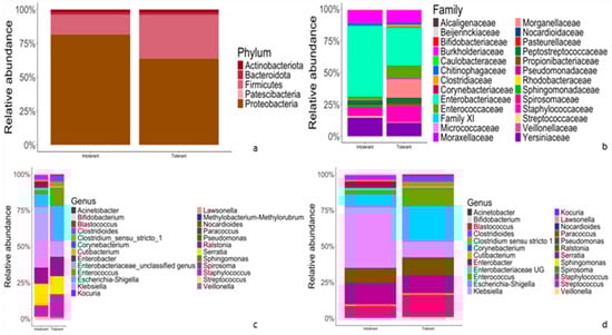 At the phylum level (Figure 2a), in both intolerant and tolerant neonates, the predominant phyla were Proteobacteria (81.4% in intolerant and 63.7% in tolerant neonates), followed by Firmicutes (14.7% in intolerant and 32.3% in tolerant). These two dominant phyla accounted for more than 95% of the bacteria in both groups (Figure 2a). At the family level, Enterobacteriaceae accounted for the highest proportion in both intolerant and tolerant newborns, followed by Yersinaceae and Burkholderiaceae in intolerant neonates and Staphylococcacae and Burkholderiaceae in tolerant patients (Figure 2b).